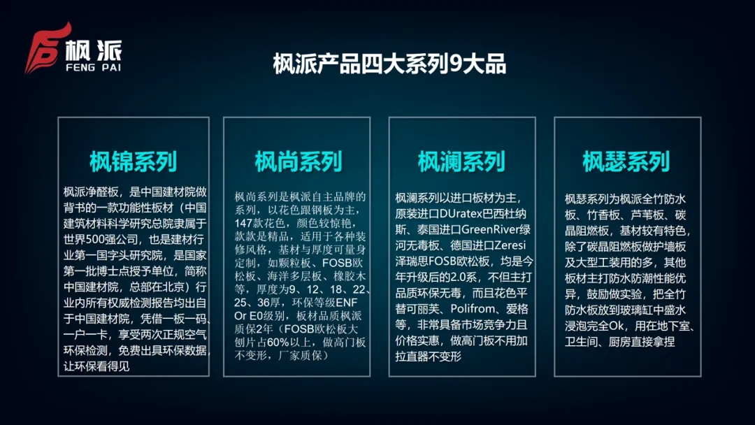 •       大连枫派新材料科技有限公司于2012年成立,自此开启了在板材领域的征程。作为大连市室内装饰协会常务理事单位,枫派将全部精力投入到板材的研发、生产与销售,凭借着持之以恒的努力和对品质的执着追求,逐渐在竞争激烈的市场中崭露头角。